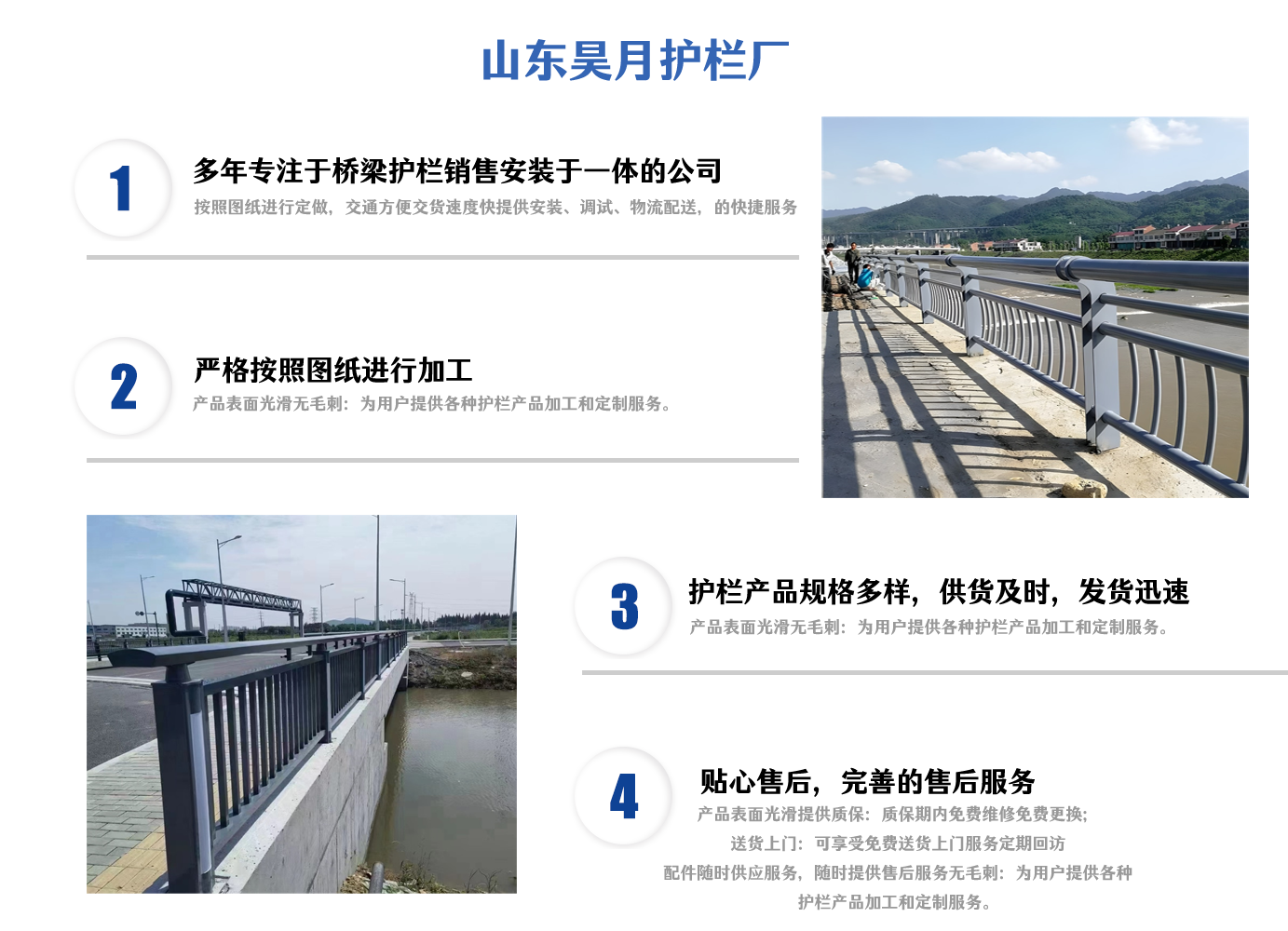 山東昊月金屬制品有限公司坐落于原材料豐富人文和諧交通發(fā)達及有“江北水城”之稱——聊城。 公司以科技興廠為宗旨,積極引進人才和技術,不斷開拓創(chuàng)新. 主營產品:SS級橋梁防撞護欄,不銹鋼復合管護欄,鋁合金護欄,燈光護欄,河道護欄等等。產品本公司建立了一套科學的行之有效的質量體系,擁有一支高技術、高素質團隊,堅持以“誠信”為本,堅持“優(yōu)質的質量、貼心的服務”為崇高理念,為用戶提供質優(yōu)價廉的產品提供至真至誠的服務。與客戶合作雙贏、攜手共創(chuàng)輝煌。 公司以科學的工藝、嚴格的質量管理、完善的服務理念、合理的銷售價格贏得了良好的聲譽,建立了密切和愉快的合作關系。多年來,我們一直以良好的品質、合理的價格,完善的質量保障體系,完善的售后服務為客戶提供周到的服務,滿足廣大客戶的需求。 我們以信譽求生存,以質量去競爭,以真誠換合作,以效益求發(fā)展,是我們的服務宗旨。我們積極主動與同行加強交流與時俱進,邁向新的歷程!我們竭誠歡迎您的咨詢和洽談,愿與同行業(yè)的同胞們合作共贏。...